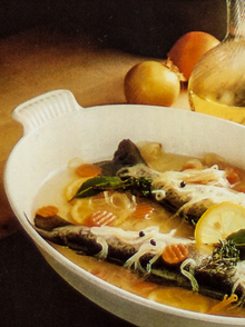 Die Forellen in eine große feuerfeste Form legen, auf den Herd stellen und sofort mit der heißen Marinade übergießen.